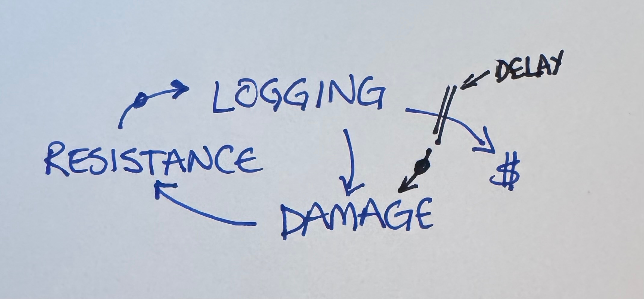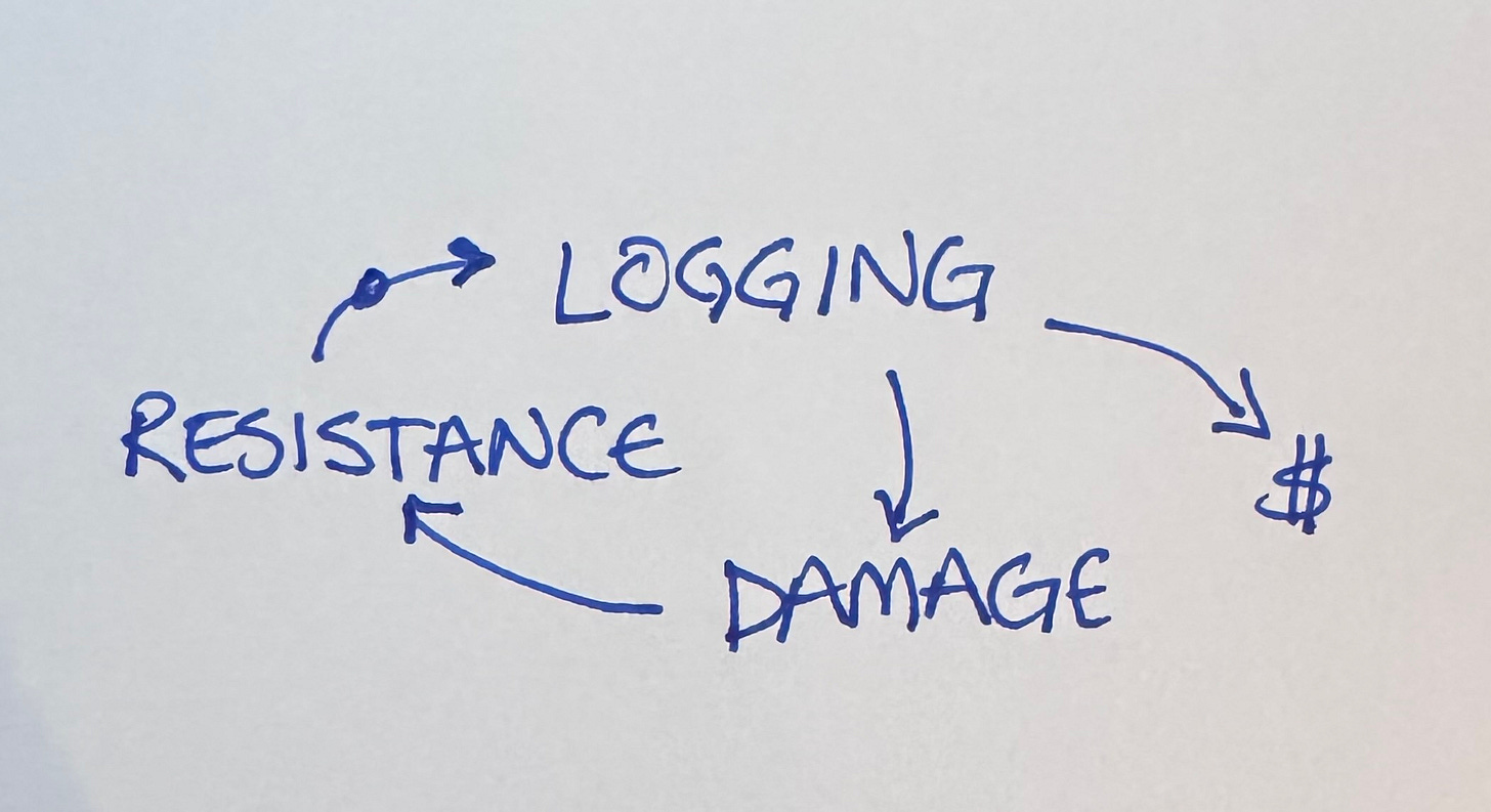 Now we have a reinforcing loop. More logging. Less damage (because the loggers get paid in a decade). Less resistance. More logging (in the form of forest thinning.)
