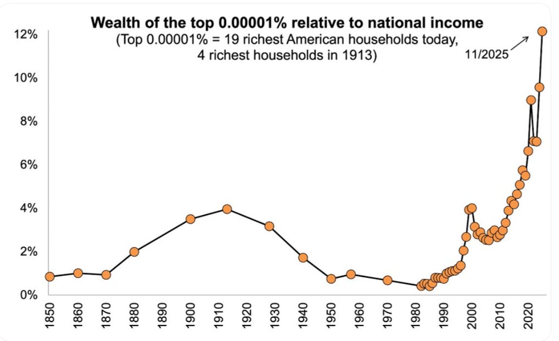 And then what you can do with this type of time series is you can compare today’s situation to the Gilded Age. And in the Gilded Age, the number was 4%, meaning the very top [bracket] owned in wealth the equivalent of 4% of US national income. And so by that metric, this new Gilded Age is characterized by much stronger concentration at the top than the original Gilded Age, with a very fast pace of increase since 2010, and particularly fast over the last couple of years. And so I think it’s a good illustration of just the overwhelming economic and also political power that this tiny elite has acquired in America, which is truly unprecedented.
